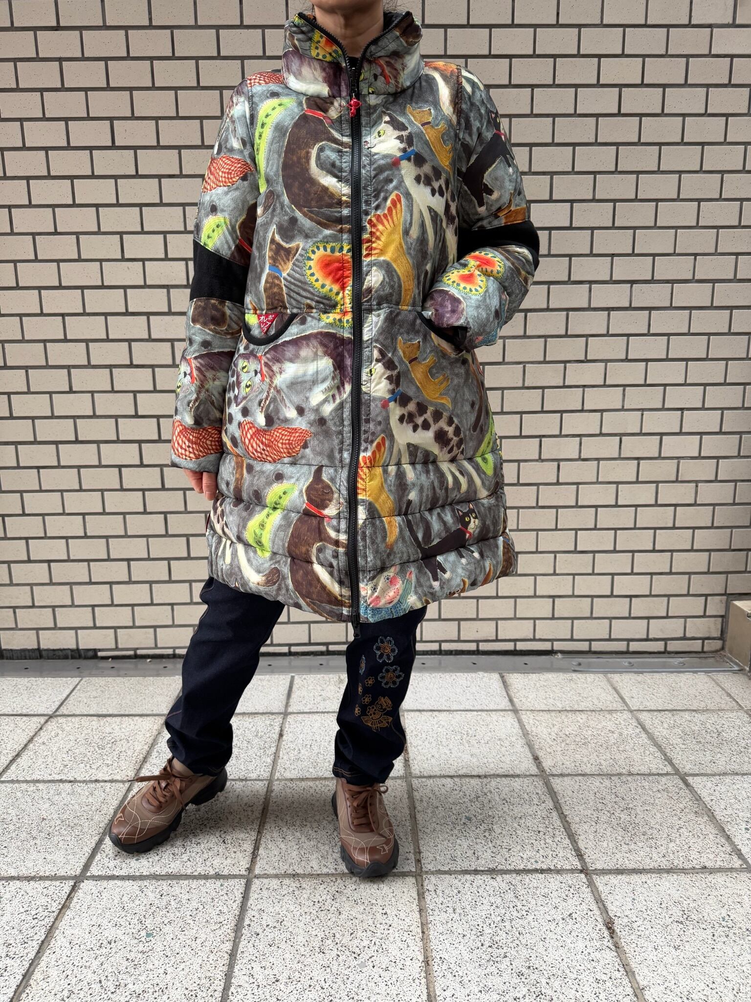 ブタさん刺繍のネコプリント ナイロンリップリバーシブルダウンコートは、ユニークなネコとブタさんのデザインが魅力的なアウターです!