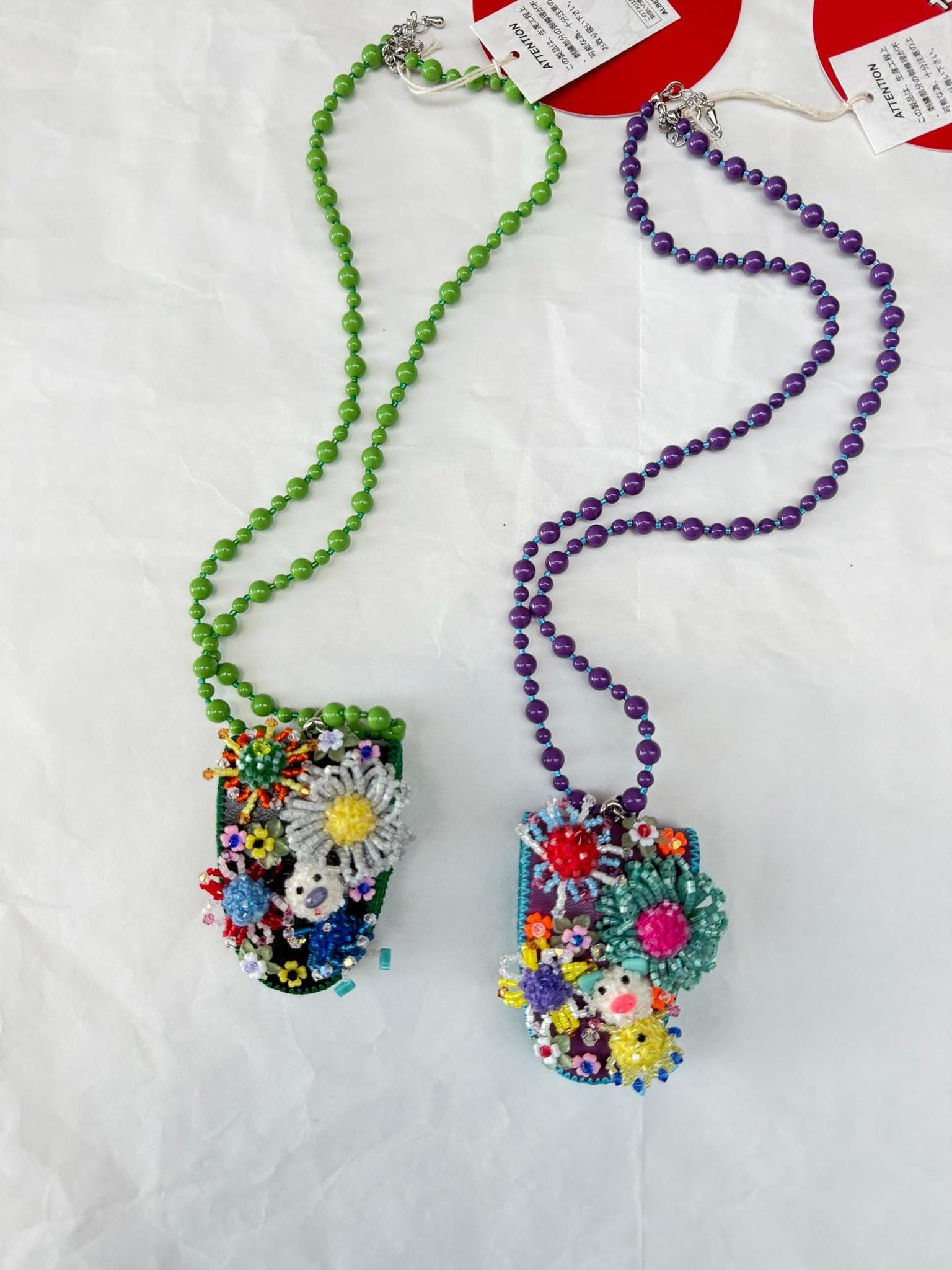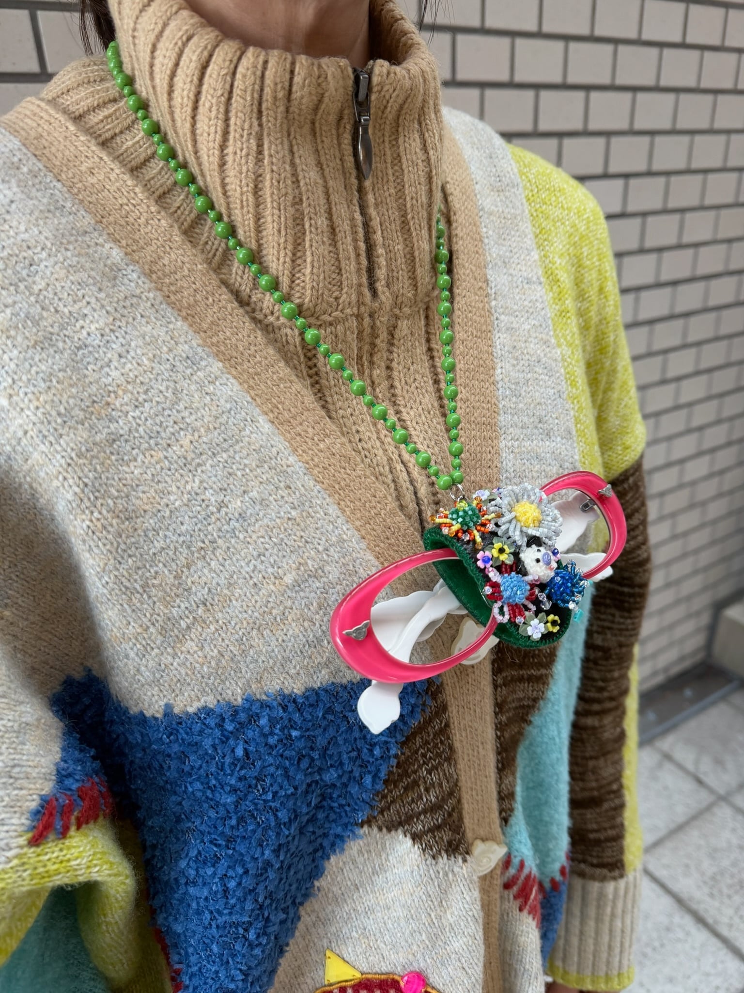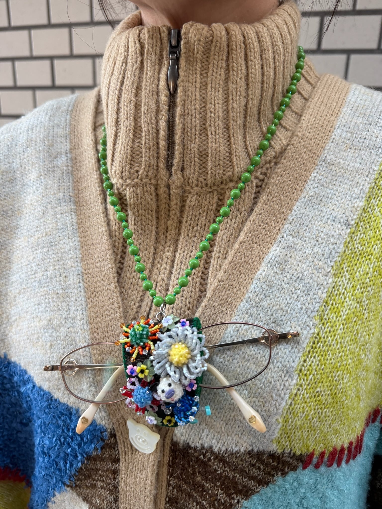 ぶたさんとお花のビーズモチーフ ネックレス式 メガネホルダー