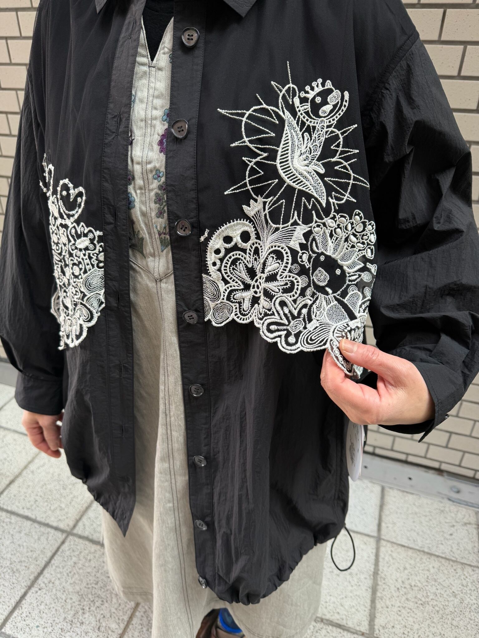 ヴィンテージナイロンタフタ+チュール♪ ブタちゃんとflower☺︎ ミシン刺繍シャツコート